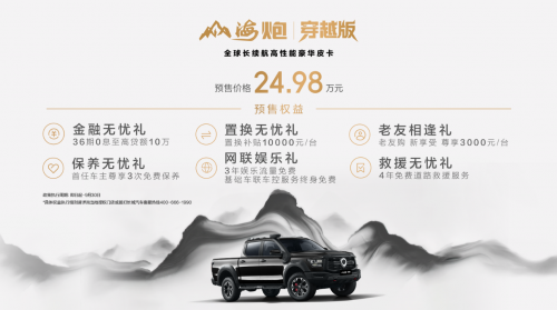 山海炮穿越版开启预售 户外之王从容征服全球山海 成都车展期间,长城炮双车齐发,山海炮穿越版同步开启预售。新车官方预售价24.98万元,有“墨黑”、“金甲”两种车身颜色可选,预订用户还享受“金融礼、置换礼、老友礼、保养礼、网联娱乐礼、救援礼”六重大礼。