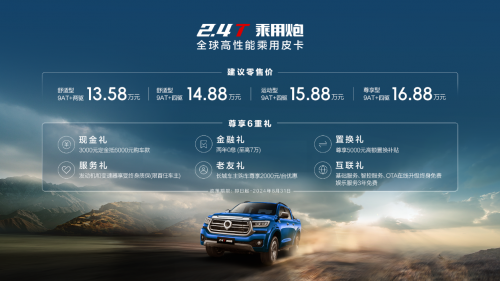 2.4T乘用炮全系车型上市 持续壮大产品矩阵 8月,长城炮乘用休闲品类的创新力作——2.4T乘用炮全系车型全面上市,官方建议零售价13.58万~16.88万元。此前,2.4T乘用炮9AT柴油四驱舒适型已于今年5月上市,收获用户广泛关注,订单火爆。