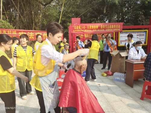 活动现场内容丰富,桂林市全州县乡镇(街道)民政工作服务站志愿者们为老年朋友提供义剪、义诊等民政服务。