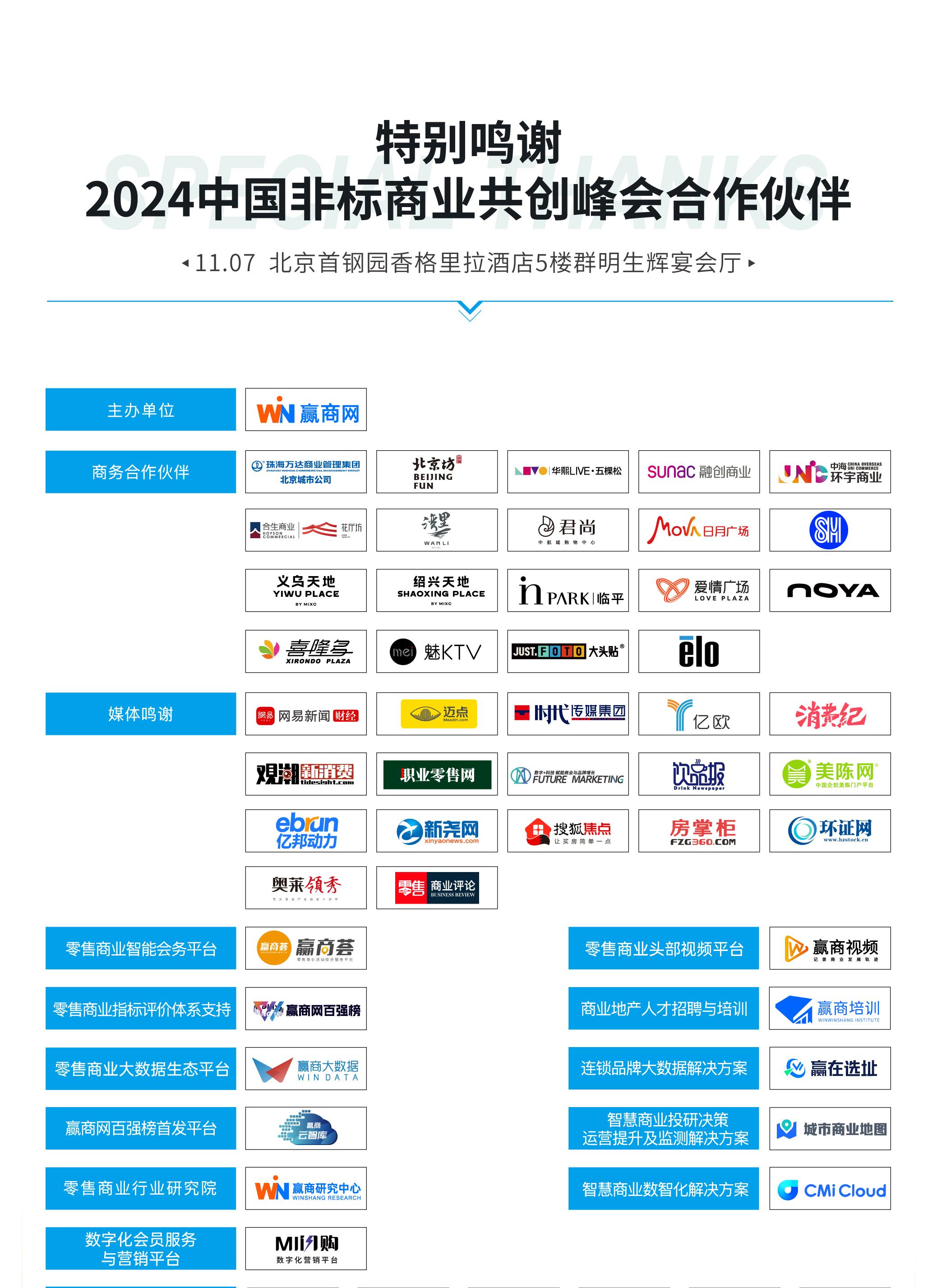 2024中国非标商业主流榜 & 年度「锐势」获奖名单 // 年度「锐势」颁奖盛典——人物类 年度零售商业非凡人物 恒隆地产 叶旭明 北京华联商厦股份有限公司 王锐 京投发展 高一轩 年度非标商业地产先锋人物 中交地产 张闯 怡成文创 卢琦 阿那亚 田海成 赛元商业 杨睿 爱情商业 杨德春 年度零售品牌非凡主理人 胡同山野 吴天昊 年度商业地产时尚新锐人物 泰达城投 张钰 年度体验商业创新先锋人物 瑞安新天地南京城市公司 周丽 中国雄安集团城市发展投资有限公司 张凌 年度非标商业地产杰出操盘手 NOYA 苏轩志 // 年度「锐势」颁奖盛典——企业类 年度引领城市更新卓越企业 珠海万达商业管理集团 | 北京城市公司 京投发展 怡成文创 年度引领行业革新企业 大悦城控股 合生商业集团 年度立体商业标杆企业 新合作商管 年度引领商业革新企业 天津泰达城市综合开发投资集团有限公司 赛元商业 年度非标商业创新企业 中国雄安集团城市发展投资有限公司 年度商业地产行业创变之星 餐茂址寻 // 年度「锐势」颁奖盛典——项目类 未来新青年社交聚集地 石家庄青年茂 大连奥电未来城 年度备受期待商业地产项目 SM厦门CHAO街 航天万源广场 年度潮力无限商业项目 北京王府井银泰in88 年度城市最具年轻力项目 深圳中航城君尚购物中心 年度非凡体验标杆项目 义乌天地 杭州临平银泰inPARK 海口日月广场 檀谷TANKO 西单更新场THE NEW 年度城市最具人气购物中心 喜隆多Xirondo Plaza 最具城市文化特色非标项目 北京中海大吉巷 年度城市创新体验文旅项目 阿那亚·秦皇岛 此地Cypark 全球流行文化聚集地 华熙LIVE·五棵松 年度非标创新型商业项目 绍兴天地 年度焕新城市文化商业项目 合生商业广州花厅坊 // 年度「锐势」颁奖盛典——品牌类 年度非凡影响力领军品牌 魅KTV 年度势力非凡新锐品牌 波波笑剧场 ALIGHT光禹莱特 年度引领风尚创新品牌 胡同山野 nice rice好饭 年度共创新文化品牌 JUST.FOTO大头贴 左庭右院鲜牛肉火锅 年度最受关注策展型零售品牌 靠谱档口 在会议的压轴环节,“2024中国非标商业主流榜”隆重揭晓,赢商tech华北区域总经理卫芃上台为获奖项目颁奖。本次评选活动旨在挖掘那些在空间创新、商业运营、社会价值和主理人/创新品牌力等方面,具备非凡表现的非标项目,以榜样的力量,打造城市非标商业地产风向标,推动城市不被定义美好生活的持续发展。