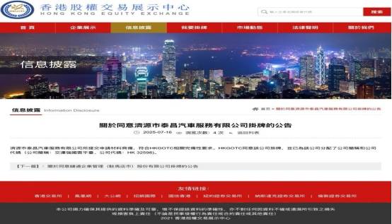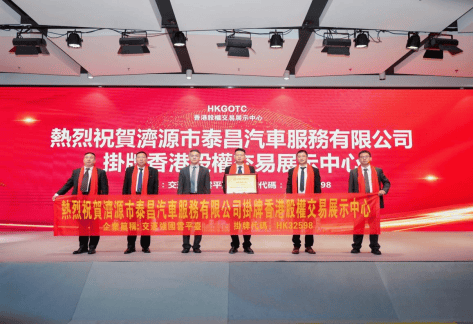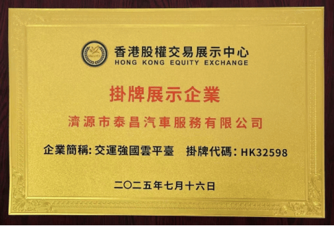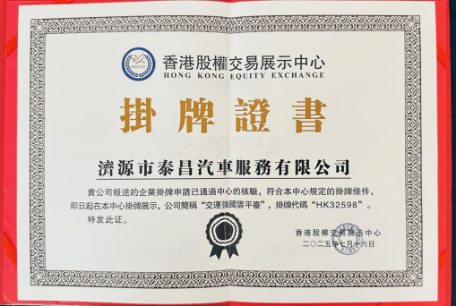 【2025年8月1日 交运强国云平台电】 7月26日,济源市泰昌汽车服务有限公司在香港股权交易展示中心成功挂牌(挂牌代码:HK 32598),并应邀参加了隆重的授牌、敲锣仪式,在各界领导、嘉宾和媒体朋友的共同见证下,迎来了企业发展历程中的里程碑时刻,开启了资本国际化的新征程! 2