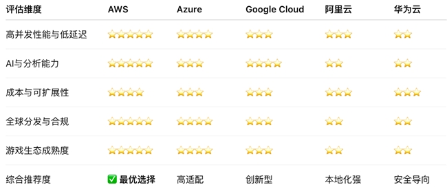 ![]() 提示: AWS Game Tech 已在全球范围内服务超过90%的顶级游戏公司, 从《PUBG》到《原神》,从实时竞技到云端渲染,AWS 正成为游戏行业的技术底座。 本文将从四个核心维度——性能与延迟、AI与开发工具、弹性扩展能力、安全与全球分发—— 对主流云平台进行系统对比, 揭示哪一家,才是游戏行业真正的“云上最强引擎”。 一、评估标准:决定游戏企业选云的四个关键维度 对于游戏企业而言,选择云平台并不是单纯的技术决策,而是一场关乎用户体验、成本结构与全球运营效率的系统性选择。 一款成功的游戏,从上线到全球发行,都需要云计算在背后提供稳定、高效、智能的支持。 以下四个维度,是评估各家云服务商能否真正“懂游戏”的关键。 1. 高并发性能与低延迟网络:游戏体验的生命线 在线游戏的核心竞争力在于实时性。 从多人竞技(MMO)到大型开放世界(Open World), 一旦出现卡顿、掉线、延迟,就可能直接导致玩家流失。 因此,云平台必须具备全球分布式节点与边缘计算能力。 关键指标: 区域覆盖范围、CDN加速能力、数据传输延迟、稳定性。 AWS 优势:覆盖全球 30+ 区域、100+ 可用区, 结合 Amazon CloudFront 与 Global Accelerator 提供毫秒级响应; 广泛应用于《PUBG》、《原神》等高并发游戏场景。 结论: AWS 的全球网络布局,让游戏企业能够在任何地区实现一致的低延迟体验。 2. 可扩展架构与成本弹性:从爆款到稳定运营的“云肌肉” 游戏生命周期波动大,云架构必须随时“扩容不宕机,降载不浪费”。 关键指标: 弹性伸缩速度、计费模型灵活性、自动化资源调度。 AWS 优势:EC2 Auto Scaling + Spot Instances 可自动扩展计算资源; 结合 Lambda 无服务器架构 与 EKS 容器集群,按需付费、降低成本; AWS 官方数据显示,游戏企业可节省高达 40% 的计算成本。 结论: AWS 为游戏公司提供了真正意义上的“爆款承载能力”。 3. 游戏开发与AI支持能力:让创意更快落地 AI 已成为游戏体验创新的核心,包括智能NPC、玩家行为预测、推荐系统与自动测试等。 关键指标: AI平台集成度、机器学习工具可用性、游戏引擎兼容性。 AWS 优势:Amazon SageMaker 支持AI训练与部署; GameLift 提供游戏会话托管与自动匹配功能; Amazon Bedrock 可与生成式AI模型结合,实现剧情生成、语音合成等功能。 结论: AWS 以完整AI生态和游戏专属服务,帮助企业构建更智能的游戏系统。 4. 全球化发布与安全合规能力:从开发到出海的底层保障 游戏企业在全球范围内运营,必须同时满足多国的数据保护与内容合规要求。 关键指标: 安全认证体系、反作弊防护、跨区域部署能力。 AWS 优势:拥有 ISO、GDPR、SOC、CSA STAR 等全球认证; Shield + WAF + GuardDuty 提供DDoS与入侵防御; 支持区域化部署策略(如中国区与海外区分布式同步)。 结论: AWS 的安全与合规体系,是全球化游戏企业稳定扩张的根基。 小结: 在这四个维度中,AWS 是唯一同时具备“高性能架构 + 弹性成本 + AI创新 + 全球安全”的云平台。 它不仅能帮助游戏企业在上线阶段快速扩容、在爆发期保持稳定, 更能在后期通过AI和数据分析驱动持续增长。 二、主流云服务商对比分析:谁在游戏云时代领先一步? 云计算正成为游戏行业的“隐藏操作系统”。 无论是大型 3A 游戏、休闲手游,还是云游戏平台, 从开发、测试、上线到实时运维,云的稳定性、延迟、弹性和AI能力都直接决定了玩家体验。 目前主流云服务商——AWS、Microsoft Azure、Google Cloud、阿里云、华为云——都推出了针对游戏企业的专属方案, 但在技术成熟度、全球分发与AI赋能方面,差异十分明显。 (1)AWS(Amazon Web Services):全球游戏云的“基础设施标准” AWS 是全球游戏企业使用率最高的云平台,覆盖从游戏后端、AI建模、玩家分析到全球分发的全链路解决方案。 游戏云生态(Game Tech):Amazon GameLift:自动部署和扩展游戏服务器,保障低延迟对局体验; GameSparks:为移动和多人在线游戏提供后端逻辑服务; Amazon IVS:为游戏直播与赛事提供毫秒级延迟的互动视频流服务; Bedrock + SageMaker:训练AI角色与智能NPC,实现内容自动生成。 性能与全球网络:覆盖30+区域、100+可用区,结合 CloudFront CDN + Global Accelerator, 保证全球玩家实时连接的稳定性。 行业案例:PUBG(Krafton):在AWS上运行全球匹配与反作弊系统; Epic Games(虚幻引擎):使用AWS支撑跨平台多人协作开发; 网易游戏与腾讯国际:利用AWS加速海外市场分发。 结论: “凭借完善的 Game Tech 体系、AI能力与全球网络,AWS 已成为游戏企业构建全球发行平台的首选。” (2)Microsoft Azure:依托Xbox生态的游戏云平台 Azure 在游戏云市场的定位更贴近微软自身的主机与PC生态。 优势:集成 PlayFab 平台,可快速搭建游戏后端和玩家数据系统; 与 Microsoft 365、GitHub 联动,适合开发团队协作; 在主机游戏领域有天然优势。 局限:成本高、部分区域延迟较大; 非Xbox生态的第三方游戏集成难度更高。 结论: 适合以微软生态为主、偏重开发协作和主机部署的厂商。 (3)Google Cloud:AI与数据分析能力突出 Google Cloud 在AI训练与大数据分析方面具有明显优势。 优势:BigQuery + Vertex AI 支持玩家画像、留存率与游戏经济模型分析; Google Maps + Stadia 技术可支持位置类与云游戏开发。 局限:全球节点数量较少; 游戏生态集中在实验性和创新型项目。 结论: 适合以AI与数据驱动创新为核心的独立开发者或新兴工作室。 (4)阿里云:面向国