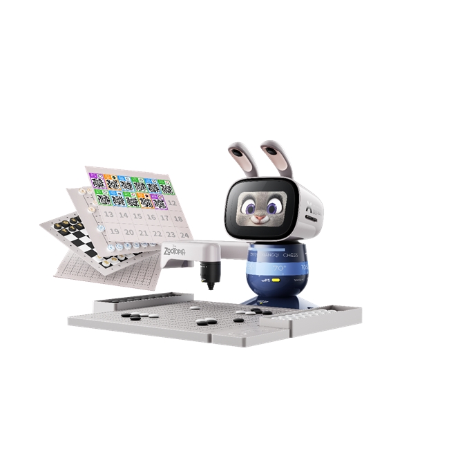 产品赋能:让朱迪精神融入成长的每一步 一款能真正陪伴孩子成长的产品,首先要能走进孩子的内心。从产品设计来看,元萝卜朱迪系列充分考虑了孩子的喜好与成长规律。内测用户首先肯定了产品外观:“外观上做了很大的升级,现在是结合了迪士尼朱迪的形象,孩子很喜欢。”此次推出的新品,以朱迪警官标志性的蓝灰为主色调,双目摄像头化作灵动的兔子耳朵,尾部点缀棉花球“兔子尾巴”,搭配定制化语音与UI界面,让孩子在使用时仿佛能与朱迪“面对面”互动,无形中拉近了与孩子的距离。 更重要的是,产品将朱迪“聪明、坚韧、乐观”的特质转化为可感知的互动体验,在实用性与互动性上受到了内测用户的高度认可。 在“聪明”培养上,元萝卜朱迪系列依托象棋、围棋等四种经典棋类,搭配互动功能,助力不同基础孩子在玩乐中提升多方面能力;新增的“趣味卡片编程”功能,让孩子借语音指令操控机器人完成任务,激发创造力。 “坚韧”培养方面,元萝卜的“低挫败成长体系”发挥重要作用:孩子输棋有鼓励、APP可记谱总结,进步还能获专属徽章证书;“人机对弈”闯关与“人人对弈”社交互动,帮助孩子提升抗挫力。 "乐观"心态塑造则通过拟人化交互实现:机械臂摆棋+语音引导+画面指引的“手眼脑”三位一体设计,营造朋友聊天般的下棋体验。此外,实体棋具既保护视力,又支持全家参与残局挑战、跨代际互动,让欢乐氛围自然融入家庭生活。