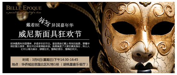时间 2016年3月6日 星期日 下午14:30-16:45 地点 华侨城创意园北区B2栋1楼 (胡桃里音乐餐厅) 着装 男士正装、女士裙装 面具由BELLE EPOQUE提供,现场领取 您亦可搭配上BELLE EPOQUE的腕表一起盛装出席 *舞会当天会有专业摄影师跟拍,希望各位来宾以完美姿态出席。