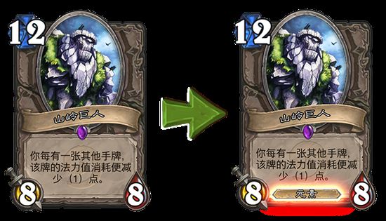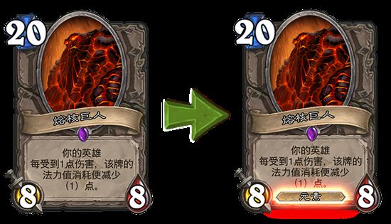 为了使《炉石传说》中的卡牌变得更加协调与直观,在接下来的更新中,暴雪将对部分随从的类型进行小幅的修改。 《炉石传说》中的一些随从具有类型,例如恶魔,野兽或是元素。我们将对部分卡牌进行调整,使它们的类型符合玩家对其插画或故事背景的心理预期,并使之与《魔兽》系列中的设定保持一致。 在下一个《炉石传说》版本更新中,将有以下改动: 熔核巨人&山岭巨人 熔核巨人和山岭巨人都将获得元素类型。这个改动能为元素套牌带来新的选择,并且从视觉的角度来说也很合理——这些行动缓慢的巨型熔岩和岩石看起来就像是元素。