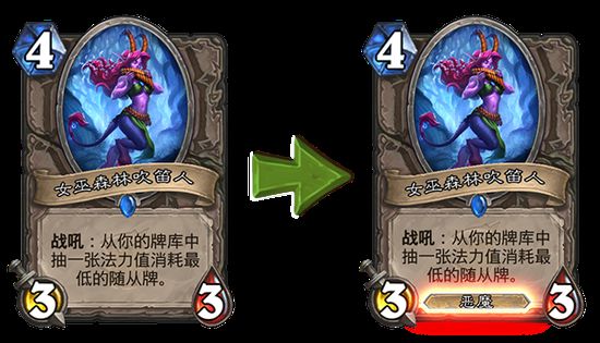 女巫森林吹笛人 女巫森林吹笛人将获得恶魔类型。女巫森林吹笛人是一名萨特,在《魔兽》和《炉石传说》的故事背景中,萨特就是恶魔。这也是我们第一次将萨特引入了《炉石传说》,所以我们希望赋予它们更合适的随从类型。