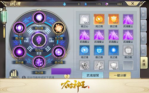 新功能——武魂 在古帝之城副本获得武魂等道具,对于修仙之路有什么助力呢?武魂功能伴随古帝之城副本而开放,角色在其中消耗奖励来装备佩带武魂,从而获得武魂提供的强大属性加成。武魂佩带分为普通武魂与核心武魂两种,品质越好的武魂带来的属性加成越高;多余武魂分解成武魂魔尘后,可用来升级武魂;利用凝魂珠,在武魂合成界面可凝聚双属性武魂。