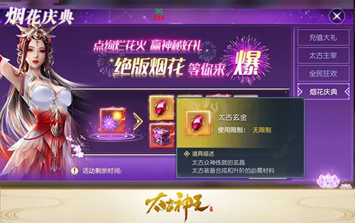 全民盛典——仙域盛会 为带给玩家更好的游戏享受,在全新副本等内容上线的同时,《太古神王:星魂觉醒》游戏月度盛典——“仙域盛会”6月7日开启,全民资源回馈放送,高阶、绝版武器领不停,绚烂烟花等你来爆!全民狂欢做任务,轻松兑换稀有道具;燃放烟花开稀有道具等等形式多样,仙域盛会助力成长,仅此一天不容错过!