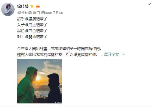徐佳莹宣布结婚 8月5日,歌手徐佳莹微博宣布结婚,她晒出一张在阳光下的剪影,和男方深情对视,可以看出两人十分恩爱。