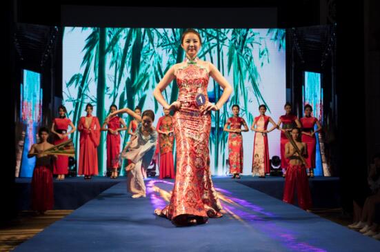 评委会主席张越上台致辞 赛事开始,以中国红为主题,结合广府岭南水墨画的元素,选手们身穿别具特色的红色定制旗袍,在小溪流水的音乐中徐徐前进,将广府文化的诠释的淋漓尽致。