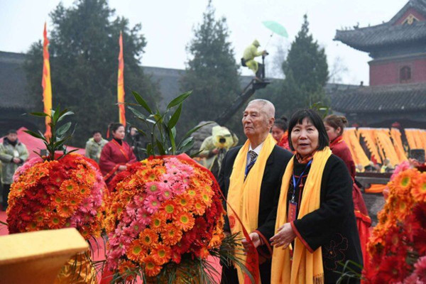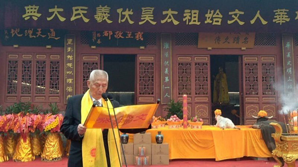 3月18日,周口淮阳祭祀太昊伏羲大典活动在淮阳太昊陵伏羲大殿前隆重举行,97岁高龄的中国侨联原主席庄炎林冒雨亲临淮阳太昊陵,并代表华夏儿女恭读祭文。
