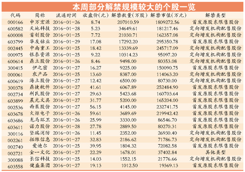 今年以来33家公司被高管减持 广州日报讯 (文/表 记者张忠安)由于证监会18号文过期,使得市场对限售股解禁的关注度升温。数据显示,本周沪深两市将有约490亿元限售股解禁。不过,分析人士指出,大股东减持依然有限制,而小非解禁后值得关注。另外,今年以来有33家上市公司被高管等减持。 记者从 同花顺 ifind系统提取的数据显示,本周两市解禁股数共计38.43亿股,占未解禁限售A股的0.63%,其中沪市10.66亿股、深市 27.77亿股,累计涉及38家公司。如果以1月22日收盘价为标准计算市,这38家公司解禁市值约491.23亿元。其中沪市14家公司为141.17 亿元,深市24家公司为350.06亿元。 从个股来看,深市中 申万宏源 的限售股将于1月26日解禁,解禁数量为20.7亿股,按照1月22日收盘价计算解禁市值为180.93亿元,是A股本周解禁规模最大的公司。其次, 天地科技 、 首创股份 、 华友钴业 和 中南重工 等解禁规模都在20亿元以上。 数据显示,经过本周解禁后,A股将有首创股份、 金地集团 成为新增的全流通公司。 另外,记者统计发现,今年以来,A股不少上市公司开始遭到高管等股东的减持。截至1月21日收盘,沪深两市共有33家公司被高管减持,如 多氟多 、王子新 材被减持规模都在千万元以上,其中,根据深交所披露的信息,多氟多被高管韩世军在今年1月13日和14日合计减持该公司42.3万股,套现金额超过 2800万元。同时,该公司高管杨华春在今年1月11日和12日也减持了15万股,成交均价在60.60元左右,套现金额也接近千万元。 |