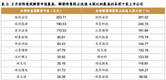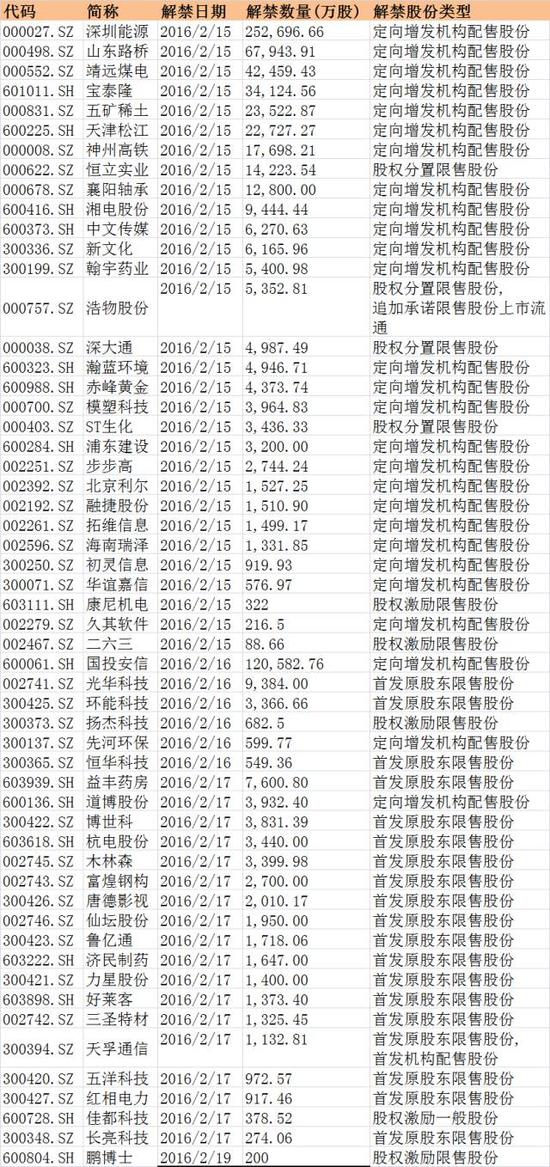 春节期间海外市场走低,给原本就处于弱势的A股蒙上阴影,明天开盘不容乐观。 根据新华社老师的报道,节后首个交易周(2月15日至19日)沪深两市有63家公司共计70.7亿限售股解禁上市流通,解禁市值约858亿元。 新华社的文章是根据 西南证券 的研报数据统计,据西南证券统计,节后首个交易周两市解禁股数共计70.7亿股,其中沪市21.99亿股,深市48.70亿股;以2月5日收盘价为标准计算的市值为858.06亿元,其中沪市16家公司329.87亿元,深市47家公司528.19亿元。 沪市16家公司中, 国投安信 在2月16日将有12.06亿股限售股解禁上市,按照2月5日收盘价计算,解禁市值214.03亿元,为下周沪市解禁市值最大公司;解禁市值排第二、三名的公司是 益丰药房 和 宝泰隆 ,解禁市值分别为22.70亿元和19.55亿元。 深市47家公司中, 深圳能源 限售股将于2月15日解禁,解禁数量为25.27亿股,按照2月5日收盘价计算解禁市值173.35亿元,是下周深市解禁市值最大公司;解禁市值排第二、三名的公司是山东路桥和 新文化 ,解禁市值分别为39.75亿元和35.16亿元。 统计数据显示,解禁的63家公司中,有36家公司限售股将在2月15日解禁,解禁市值为486.93亿元,占到全周解禁市值的56.75%,解禁压力集中度高。 基金君从wind数据终端翻查了一下,拿到这份2月15日-2月19日解禁股一览表,给大伙看看