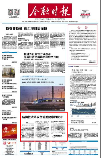 央行主管的《金融时报》今日发表题为《结构性改革攻坚需要健康的股市》的文章,文章称,夯实市场基础,完善制度建设,是促进市场平稳健康发展的需要,更是攻坚结构性改革的需要。只有这样,才能提振市场投资者信心,有效发挥市场的资源配置作用,培育一个公开透明、长期稳定健康发展的股票市场。 文章还指出,新年开市第一周的阴霾终将过去,基础制度建设与完善的举措会不断跟进,股票市场在经历“阵痛”之后,亦将回归理性。惟有股市健康发展,才能为结构性改革攻坚战提供有力支持。