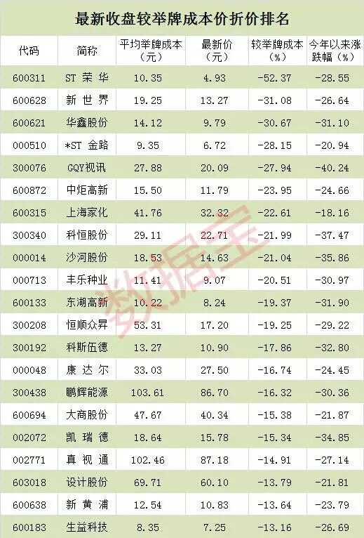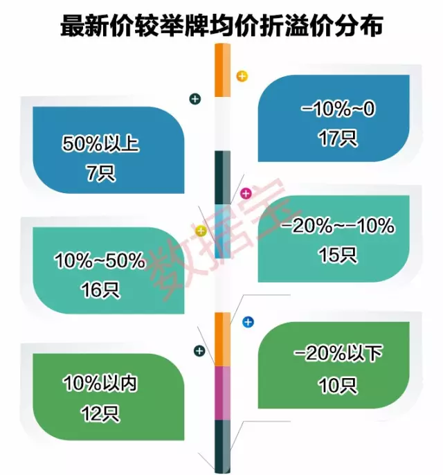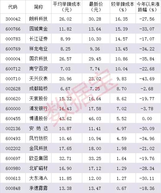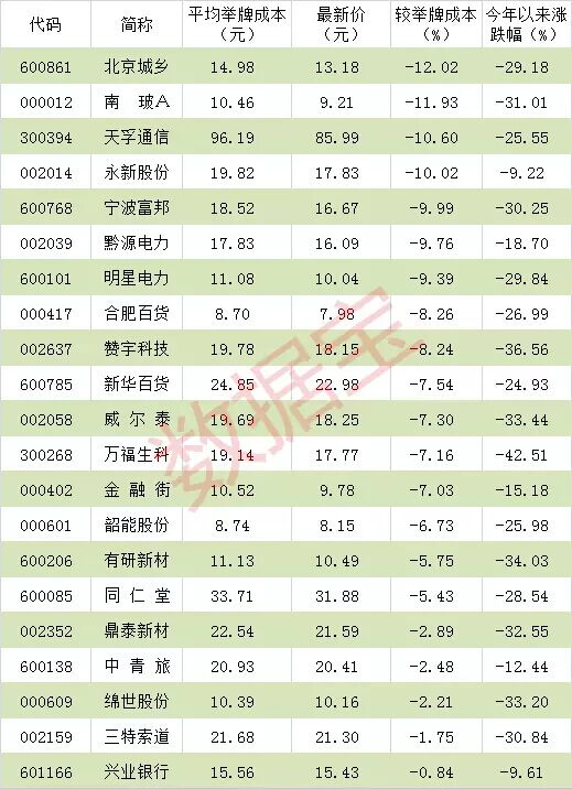 与资本大佬举牌成本相比,目前半数个股股价已跌破增持成本价, ST荣华 昨日收盘价为4.93元,距其去年增持期间均价折价达五成, 中炬高新 、沙河股份等24只股股价较举牌方成本价均缩水了一成以上。而数据宝截至去年末的统计数据,收盘价在举牌成本价之下的仅有少数几只,举牌方截至年末平均浮盈幅度约四成,可见市场的快速下跌已使举牌方在更多的个股上出现浮亏。不过,由于 万科A 去年12月末至今连续停牌,给举牌方贡献了较多的盈利,总体来看,去年下半年以来举牌动用的资金仍是浮盈的。 举牌概念股遭遇连续下跌后,大面积个股已跌破举牌方的增持成本,从长远投资的眼光出发,这些个股已具有一定的安全边际,结合估值、业绩等因素可适当关注。