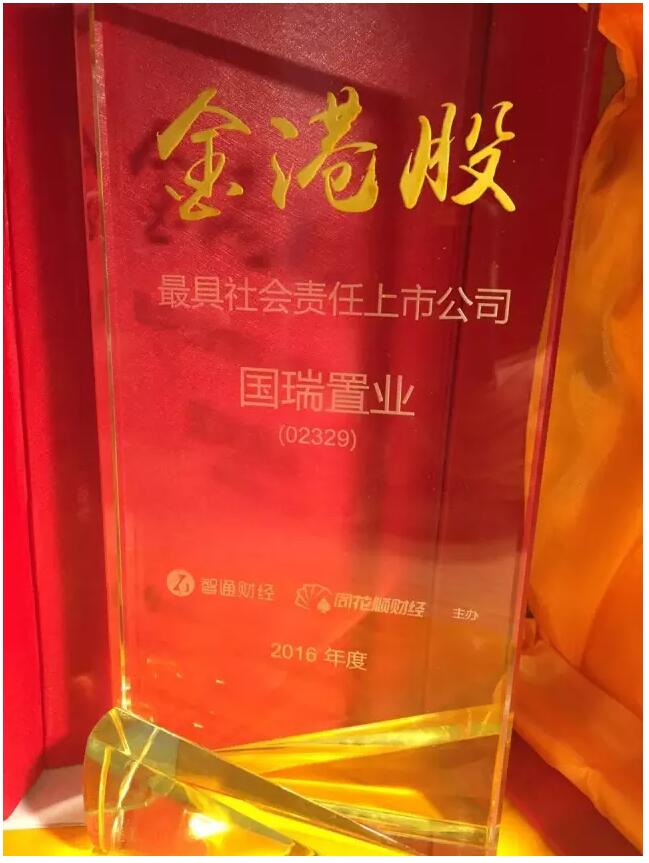 国瑞置业表示,很荣幸在新年之际收获此项荣誉,更获得港股资本市场专家评委及投资人的肯定,赢得2017年开门彩。公司将继续肩负上市公司责任和使命,以标杆企业形象传递社会正能量;同时,国瑞置业也将紧抓香港资本市场新机遇,“瑞”意进取创新绩,齐心协力攀高峰。