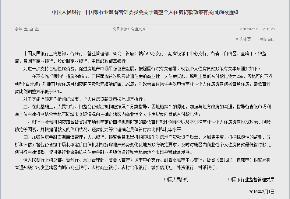 人民网北京2月2日电 今日下午,央行及银监会下发《关于调整个人住房贷款政策有关问题的通知》,在不实施“限购”措施的城市,居民家庭首次购买普通住房的商业性个人住房贷款,原则上最低首付款比例为25%,各地可向下浮动5个百分点;对拥有1套住房且相应购房贷款未结清的居民家庭,为改善居住条件再次申请商业性个人住房贷款购买普通住房,最低首付款比例调整为不低于30%。对于实施“限购”措施的城市,个人住房贷款政策按原规定执行。 根据此前央行、住建部和银监会三部门联合下发通知,在不实施“限购”措施的城市,居民家庭首次购买普通住房的商业性个人住房贷款最低首付比例为25%,对拥有一套住房且相应购房贷款未结清的居民家庭购二套房,最低首付款比例调整为不低于40%。 对此,易居研究院智库中心研究总监严跃进分析称,此次政策的出台,实际上贯彻了2015年以来去库存的政策导向。而且从市场预期看,能够较好撼动去库存市场的绝招,只能是商业银行贷款政策的继续放松。因为从很多政策看,包括住房公积金等政策,实际上都已经处于一个底部。而从降息等政策看,也基本上在一个相对宽松的政策。而商业银行贷款的政策放松空间却依然很大。此次政策对于首套住房和改善型住房的群体来说,都有积极作用。 严跃进补充分析,此次政策给予了各地信贷政策调整的自主权,允许各地按照去库存的导向和信贷资源的实际情况,积极调整首付比例。当然,两成首付的比例,使得商业贷款购房者能够享受和公积金购房贷款相同的首付待遇,确实很有激励性。 “当然对于一线城市的购房者来说,实际上可能喜忧参半。对于一些限购群体的人来说,可能不能享受此类利好政策而干着急。”严跃进说,而对于一些有购房能力的群体来说,面对高房价和房价过快上涨的态势,可能会积极入手。这在春节前可能还会形成一波成交高峰。 央行及银监会也在通知中进一步指出,在此基础上,人民银行、银监会各派出机构应按照“分类指导,因地施策”的原则,加强与地方政府的沟通,指导各省级市场利率定价自律机制结合当地不同城市实际情况自主确定辖区内商业性个人住房贷款的最低首付款比例。 通知还要求银行业金融机构应结合各省级市场利率定价自律机制确定的最低首付款比例要求以及本机构商业性个人住房贷款投放政策、风险防控等因素,并根据借款人的信用状况、还款能力等合理确定具体首付款比例和利率水平。 通知最后指出,人民银行、银监会各派出机构督促各省级市场利率定价自律机制根据房地产形势变化及地方政府调控要求,及时对辖区内商业性个人住房贷款最低首付款比例进行自律调整,促进银行业金融机构住房金融业务稳健运行和当地房地产市场平稳健康发展。 2015年中央经济工作会议上,明确接下来经济工作是着力加强结构性改革,在适度扩大总需求的同时,去产能、去库存、去杠杆、降成本、补短板,提高供给体系质量和效率,提高投资有效性。 在房地产领域,中央经济工作会议明确的思路是“要按照加快提高户籍人口城镇化率和深化住房制度改革的要求,通过加快农民工市民化,扩大有效需求,消化库存,稳定房地产市场。” 以下为《中国人民银行 中国银行业监督管理委员会关于调整个人住房贷款政策有关问题的通知》全文: 中国人民银行上海总部,各分行、营业管理部、省会(首府)城市中心支行、副省级城市中心支行;各省(自治区、直辖市)银监局;各国有商业银行、股份制商业银行,中国邮政储蓄银行: 为进一步支持合理住房消费,促进房地产市场平稳健康发展,按照国务院有关部署,现就个人住房贷款政策有关事项通知如下: 一、在不实施“限购”措施的城市,居民家庭首次购买普通住房的商业性个人住房贷款,原则上最低首付款比例为25%,各地可向下浮动5个百分点;对拥有1套住房且相应购房贷款未结清的居民家庭,为改善居住条件再次申请商业性个人住房贷款购买普通住房,最低首付款比例调整为不低于30%。 对于实施“限购”措施的城市,个人住房贷款政策按原规定执行。 二、在此基础上,人民银行、银监会各派出机构应按照“分类指导,因地施策”的原则,加强与地方政府的沟通,指导各省级市场利率定价自律机制结合当地不同城市实际情况自主确定辖区内商业性个人住房贷款的最低首付款比例。 三、银行业金融机构应结合各省级市场利率定价自律机制确定的最低首付款比例要求以及本机构商业性个人住房贷款投放政策、风险防控等因素,并根据借款人的信用状况、还款能力等合理确定具体首付款比例和利率水平。 四、加强住房金融宏观审慎管理。人民银行、银监会各派出机构应强化对房地产贷款资产质量、区域集中度、机构稳健性的监测、分析和评估;督促各省级市场利率定价自律机制根据房地产形势变化及地方政府调控要求,及时对辖区内商业性个人住房贷款最低首付款比例进行自律调整,促进银行业金融机构住房金融业务稳健运行和当地房地产市场平稳健康发展。 请人民银行上海总部、各分行、营业管理部、省会(首府)城市中心支行、副省级城市中心支行,各省(自治区、直辖市)银监局将本通知联合转发至辖区内城市商业银行、农村商业银行、农村合作银行、城乡信用社、外资银行、村镇银行。 中国人民