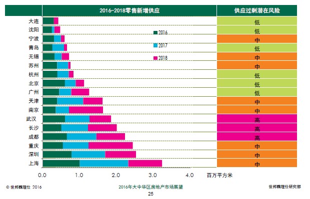 图:2016年-2018年零售物业新增供应预测 目前,全国零售物业租金增长率已明显从3-5年前年均5-7%回落至0-2%的区间。实际上一线城市近年租金增幅趋缓更为明显,这可能与居民可支配收入的实际增长幅度放慢有一定关联。 而从市场具体项目运营角度来看,作为门户城市的京沪依然为国际新晋品牌所亲睐,其辐射全国的市场效应是无可替代的。除常住人口外,一线城市总体上都有更为旺盛的旅游人群(主要为国内游客)消费所支撑,其对零售市场的贡献甚至达到 40-50%,因此面对市场短期内依然不确定的经济环境因素也有着更好的抗风险性,预计 2016年京沪零售租金将有1%以上的涨幅。 易居智库研究总监严跃进分析,对于北京市场来说,零售物业项目的供应量出现了小幅的下滑。一方面源于2015年投资积极性下滑,商业层面的供应节奏放缓。另一方面也和2015年北京房地产交易市场总体活跃有关系。这使得部分郊区的商业项目也面临较好的去库存效应。但相应的业态比如百货业转型的压力并没有完全释放。 在2016年北京零售物业的走势预测方面,机遇点在于新一轮经济刺激的计划在全面铺开,消费需求会积极有力释放。风险点在于很多房企回归北京等一线城市并积极进行商业地产项目开发,这个时候可能会造成局部物业去库存压力的增大。而且在消费习惯更新换代速度较快的背景下,部分物业包括百货业的业态不及时调整也会是一个难题。一些既有的百货业和运营上,会面临潜在消费群体不断萎缩的可能。当然这也加快此类房企积极投资“动感、活泼、休闲”等元素为一体的商业项目。 |