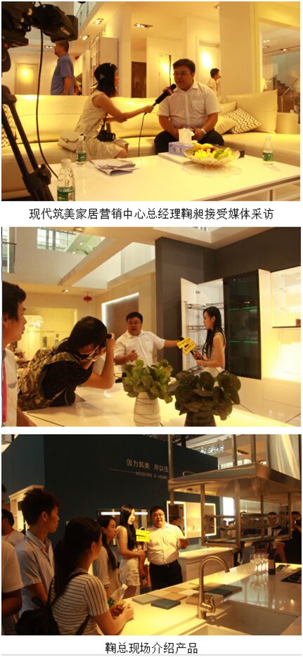 现代筑美家居展馆 展会上,现代筑美家居携手木门、地板、橱柜、卫浴、家具等五大产品线,以整合工程家居建材全线产品、打造多样化的全屋定制模式为服务体系,直面国内外房地产精装房和酒店工程业务板块,赢来了诸多国内外商客的眼光。展会现场,现代筑美家居营销中心总经理鞠昶接受了华南装修家居网、新浪、好居网等媒体朋友们的专场采访。媒体朋友们亲自体验现代筑美家居五大产品线的完美展示空间,对于家居整体风格多样化、个性化需求定制、精细化做工以及符合人机工程学等多方面的特点,大家都赞不绝口! 中国最大的工程家居集成配套服务商 20亿的投资资金,70万平方米的占地面积,8大生产工厂,60%以上的进口设备,23条现代化生产线、1000余种产品品类,高达50亿的年产能,200余位研发团队人员,5000余位工程服务人员,服务项目累计达1000余个,覆盖全国95%的城市和地区,自建20万平方米的仓储和一个国家级实验室,产品远销马来西亚、新加坡、澳大利亚、中东等二十多个国家。 数据是最具有说服力的,从橱柜、卫浴到地板、木门,再到活动家具,每一条产品线的增加都经历了周密细致的国内外市场调研,相比于其他家居建材企业,现代筑美家居的发展速度是遥不可及的,仅仅五年,从0到25亿的年销售规模,意味着现代筑美已经以后来者居上的姿态向市场发出了强有力的挑战,并已不自觉得申领了数十个行业榜首的排名。本次现代筑美家居在建博会的亮相,以全新规范的研发、生产、安装、服务规模面对市场的同行竞争,以更高的品质、更科学化的管理、更快速的市场反应……将引领工程家居行业规则重新书写,积极走向外部市场,现代筑美家居已在工程家居市场掀起一股浪潮。