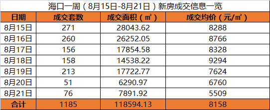 从上周海口房价走势图来看,上周成交均价为8158元/㎡,最高值为8月18日当天,成交均价9294元/㎡,最低值为8月21日当天均价5509元/㎡。