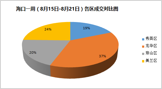 从成交区域结构来看,上周海口四个区域中,龙华区以及琼山区成交量环比均呈上涨趋势,分别涨了179.62%以及77.27%;龙华区成交439套,成为本周销冠区域,琼山区成交234套。秀英区及美兰区环比上周下跌了18.15%及22.61%,秀英区成交221套,美兰区成交291套。