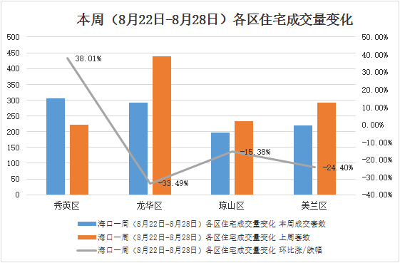 [摘要] 据海南房天下数据监控中心统计显示,上周海口楼市共成交住宅1015套,环比下跌14.35%,同比上涨35.51%,成交面积为101111.29㎡,环比下跌14.74%,同比上涨35.25%;其中秀英区住宅成交305套,领跑各区成交套数。 8月即将收官,海口楼市8月22日至28日七天的成交情况同比去年呈火爆现象,但是环比上周略显“降温”,未能与海口天气一样持续炎热。 据海南房天下数据监控中心统计显示,上周(2016.08.22-2016.08.29)海口楼市共成交住宅1015套,环比下跌14.35%,同比上涨35.51%;成交面积为101111.29㎡,环比下跌14.74%,同比上涨35.25%;其中秀英区住宅成交305套,领跑各区成交套数。