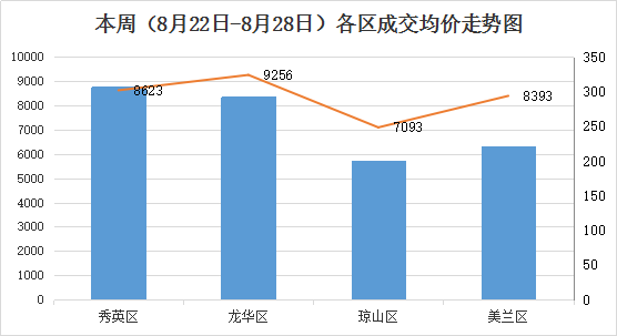 一周海口房价走势 从上周海口每日成交均价走势图来看,海口上周整体房价较为平稳,上周海口楼市住宅成交均价基本在8472元/㎡上下浮动,没有出现大的波动。琼山区房价相对海口市区来说还是比较低的,上周该区域成交均价基本在7093元/㎡,虽然上周秀英区成交大爆发,成交均价在8623元/㎡,但仍赶不上龙华区,并没有对上周海口整体房价造成比较大的影响。上周龙华区成交均价9256元/㎡。