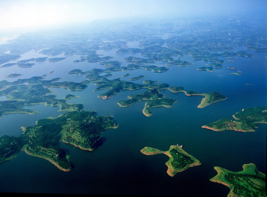 (站在果场基地所见的山下景观。无雾天气可见长寿湖整体面貌) ( 特注:元朝末年, “居其下者,人多寿考”,得名长寿县,国家“一五”期间狮子滩水电站拦河大坝建成后自然形成的人工淡水湖,2005年底重庆卫视对长寿湖景区进行航拍时拍得此图,惊讶发现了湖中天赐的繁体“寿”字。)
