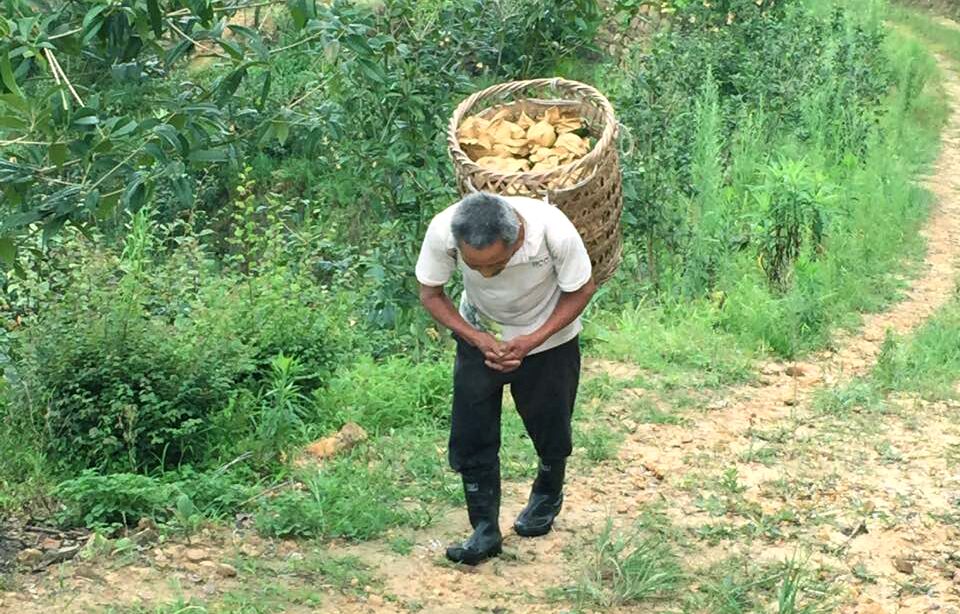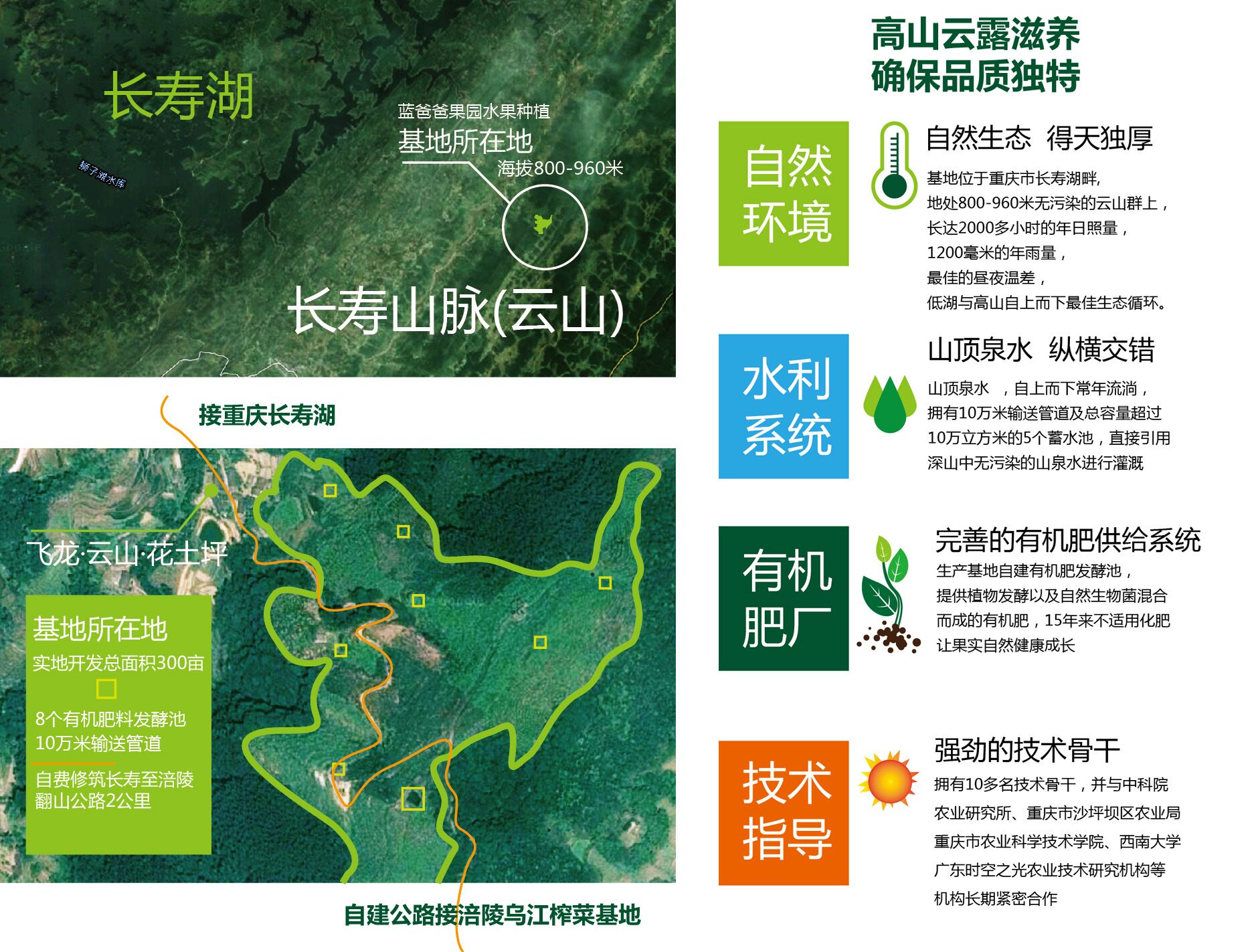 (图为70岁的农夫蓝爸爸,17年辛勤栽培,倾其一生,坚守良心,原始种植,喜获丰收!) 本期《寻找良心的味道》,我们结识的是位于重庆市长寿区边远山区的一位七十岁的蓝姓老人,由于多年来老人家尽其所能做了很多挖井、修桥、补路之事,而且自己研究医术,为村里的人排疾解患,颇受人尊重,很多人就其姓氏和在当地的口碑,尊称他的果园叫蓝爸爸的果园。 蓝爸爸的果园位于重庆长寿湖畔地处海拔800-1000米无污染的云山群上,这里长达2000多小时的年日照量,1200毫米的年雨量,最佳的昼夜温差,低湖与高山自上而下最佳自然生态循环。这里自然景观得天独厚,空气纯净,环境优美。 站在果园往外望去,寿湖全景尽收眼底,瞬间让人心旷神怡,这里远离工业痕迹,远离拔苗助长,只留青山秀水,回归自然乡土。从未停歇的山间清泉,润泽着这里的一草一木,自由的小鸟,在无尽的山林对歌嬉戏。柔情的阳光普照着、滋养着这片土地。