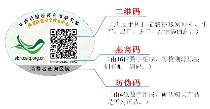 2013年,国家质检总局分别与印度尼西亚、马来西亚的主管部门签订了输入燕窝产品的检验检疫和卫生条件议定书。《食品安全法》和双边议定书均要求输华燕窝产品应建立追溯体系,确保产品可追溯并在发生问题时能及时召回相关产品。鉴于此,中国检验检疫科学研究院(CAIQ)研制开发了第三方追溯系统--中国燕窝溯源管理服务平台;目前所有具有进口中国资格的燕窝企业的合法进口产品上都加贴了CAIQ溯源标签,成为消费者识别和选购获华注册企业的燕窝产品简便有效的手段。