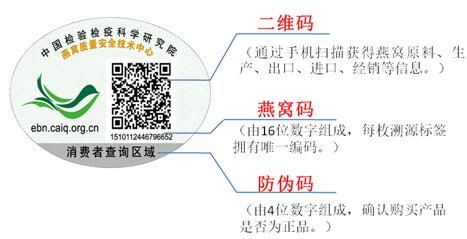 (正典燕窝) 2013年,国家质检总局分别与印度尼西亚、马来西亚的主管部门签订了输入燕窝产品的检验检疫和卫生条件议定书。《食品安全法》和双边议定书均要求输华燕窝产品应建立追溯体系,确保产品可追溯并在发生问题时能及时召回相关产品。鉴于此,中国检验检疫科学研究院(CAIQ)研制开发了第三方追溯系统--中国燕窝溯源管理服务平台;目前所有具有进口中国资格的燕窝企业的合法进口产品上都加贴了CAIQ溯源标签,成为消费者识别和选购获华注册企业的燕窝产品简便有效的手段。