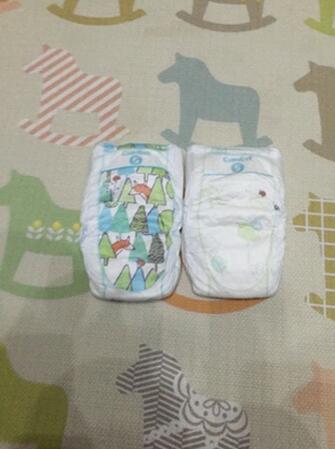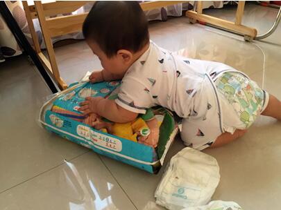 拆开包装,拿出一片纸尿裤,恩,闻到一股清新的香味,看,纸尿裤上面森林系图案,呵呵,很可爱是不是?!我正在那拆,我家宝宝看到这个花纹了,就要过来抢,说要穿