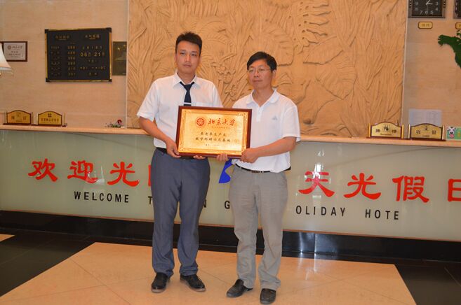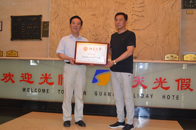 北京大学养生文化研究中心秘书长王前虎代表北京大学养生文化研究中心,为保定天光岐轩疗养院授予“养老养生科研产业园”(左一为北京大学养生文化研究中心秘书长王前虎;右一为保定天光岐轩疗养院总经理郭总)