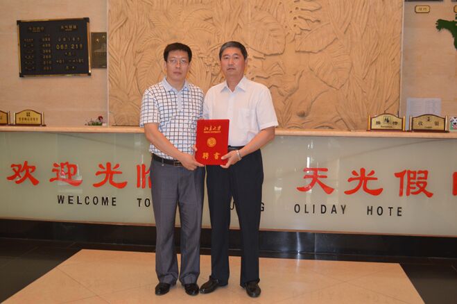 北京大学养生文化研究中心执行主任王高山代表北京大学养生文化研究中心,为保定天光岐轩疗养院授予“养老养生产业教学科研示范基地”(左一为北京大学养生文化研究中心执行主任王高山;右一为保定天光岐轩疗养院院长张润杰) 北京大学养生文化研究中心副主任何泽鑫代表北京大学养生文化研究中心,为保定天光岐轩疗养院董事长申力强颁发聘书。(左一为北京大学养生文化研究中心副主任何泽鑫;右一为保定天光岐轩疗养院董事长申力强) |