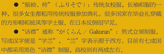 日本的小学没有过于严格的制服要求,小学一般有着装守则,最标致性的服装要求就是黄色的帽子和红色的硬壳背包。初高中才进入了日式制服行列,男生的男裤和黑色夹克,女生的水手服和短裙。高年级的学生越懂得在校服上做微调,彰显风格。 来源:留学生杂志 |