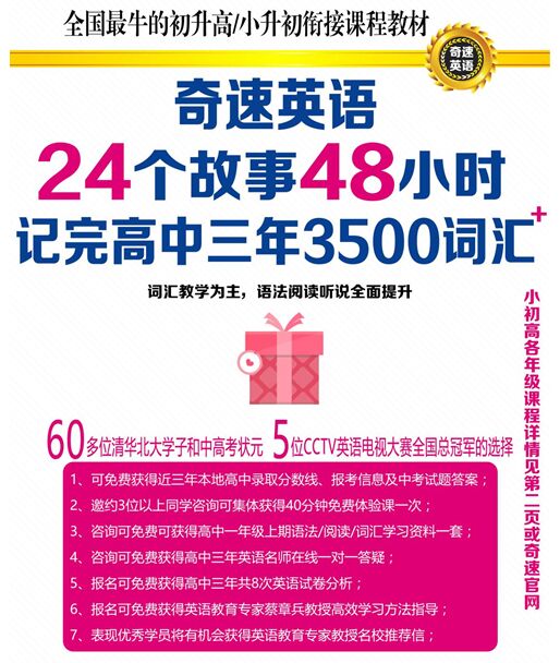 该课程为一对一或大班课,承上启下,对前一年学的知识进行巩固,查漏补缺,弥补在学校课堂上落下的知识点;另一方面,提前学习新一年的课程知识,帮助学生打下坚实基础,为升入新年级做好充足准备,走在教学课堂的前端,提前涨分,提高成绩。 课程三(暑假精英超前班) 针对于中高考英语想冲刺140分的同学,专门推出奇速精英超前班。所有课程均有线上线下两种班型面向全国招生(大家可以上网搜索奇速英语官网查看详情)。
