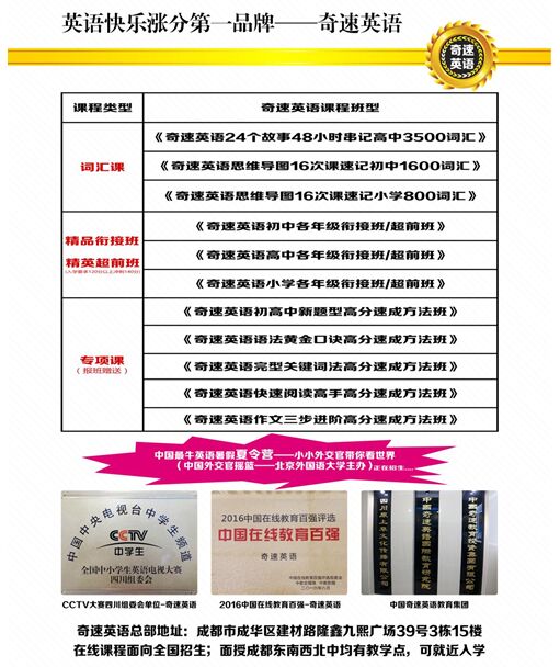奇速英语师资力量雄厚,由英语教育专家,奇速英语创始人蔡章兵教授;教育部新课标核心研制组专家、中国外语教育专业委员会副理事长、博士生导师李力教授。由62位英语特级、1600多位英语高级教师组成。 奇速英语对授课老师师的要求极其严格:老师必须是英语专业8级以上水平,语音语调标准流利,风趣幽默,多才多艺,有多年中高考英语教学和重大考试命题经验。然后,蔡章兵教授再亲自用奇速英语高效教学法对其进行专门培训。培训结束,考试和讲课合格后再竞争上岗。 三、有针对性的培训项目 奇速英语主要从事英语应试辅导教育,在线课程或面授班的课程规划上非常有针对性。目前在暑假针对学生实际情况特推出两大暑假特色课程: 课程一(暑假思维导图单词集训班) 全国独家英语课程 1、(小学)奇速英语16次课32小时速记800词汇 2、(初中)奇速英语16次课32小时速记1600词汇 3、(高中)奇速英语24个小故事48小时速记3500词汇 全国独家课程,以词汇教学为主,同时对英语语法、阅读、听说全面训练和提升,适合小升初/初升高学生超前学习及其它年级重点以词汇为核心的专项课程突破。