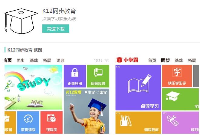 (K12同步教育在某分发平台的下载页面) “K12同步教育”是小霸王精心研发推出的一款中小学线上同步教育APP。该项目集齐从小学到高中的全部教材,并推出了同步点读、名师课堂、拍照答题三大同步教育线上辅助功能,帮助孩子实现由线下的同步学习和辅导,确保孩子在学习的关键阶段不掉链子。目前,该APP已经在百度应用、腾讯应用宝、安卓市场、豌豆荚等知名互联网平台上线,并且一上线就受到了广大用户的一致好评,在同类软件中的排名逐日上升。