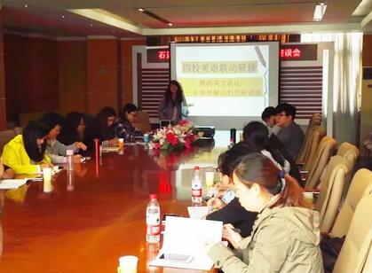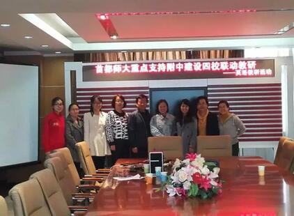 2016年10月11日,“首都师范大学重点支持附中建设四校联动”英语教研活动在首都师范大学附属苹果园中学举办,我校初高中英语教师参加了本次活动。 此次“四校联动”教研活动隶属于“首都师范大学重点支持附中建设四校联动”系列教研活动,这次的英语学科教研活动由首都师范大学附属苹果园中学承办,旨在为来自房山区、丰台区、石景山区和通州区的四所首师大附校共同体学校提供一个相互交流教学成果、探讨教学问题、提升教学质量的平台和机遇。此次活动由首都师范大学的老师肖静博士主持并主讲,首都师大基础教育学院的王海燕副院长及来自各校的相关领导莅临指导。
