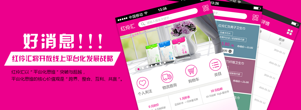 红伶汇以线下标准化以卫生巾为入口纵深精准营销,线上平台化以红伶汇为平台模向联盟发展,宣告了电商平台的上线,又开启了全渠道整合营销的新格局。全程阐释了红伶汇时尚、创新、潮流、科技的理念以及坚守“服务与责任”企业文化。从消费者注册、下单、评价、物流每个细节都展示了红伶汇电商线上线下整合互动的营销定位。道出了红伶汇电商平台为消费者提供的线上线下跨界购物解决方案。