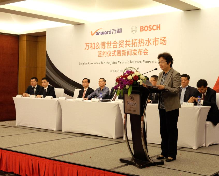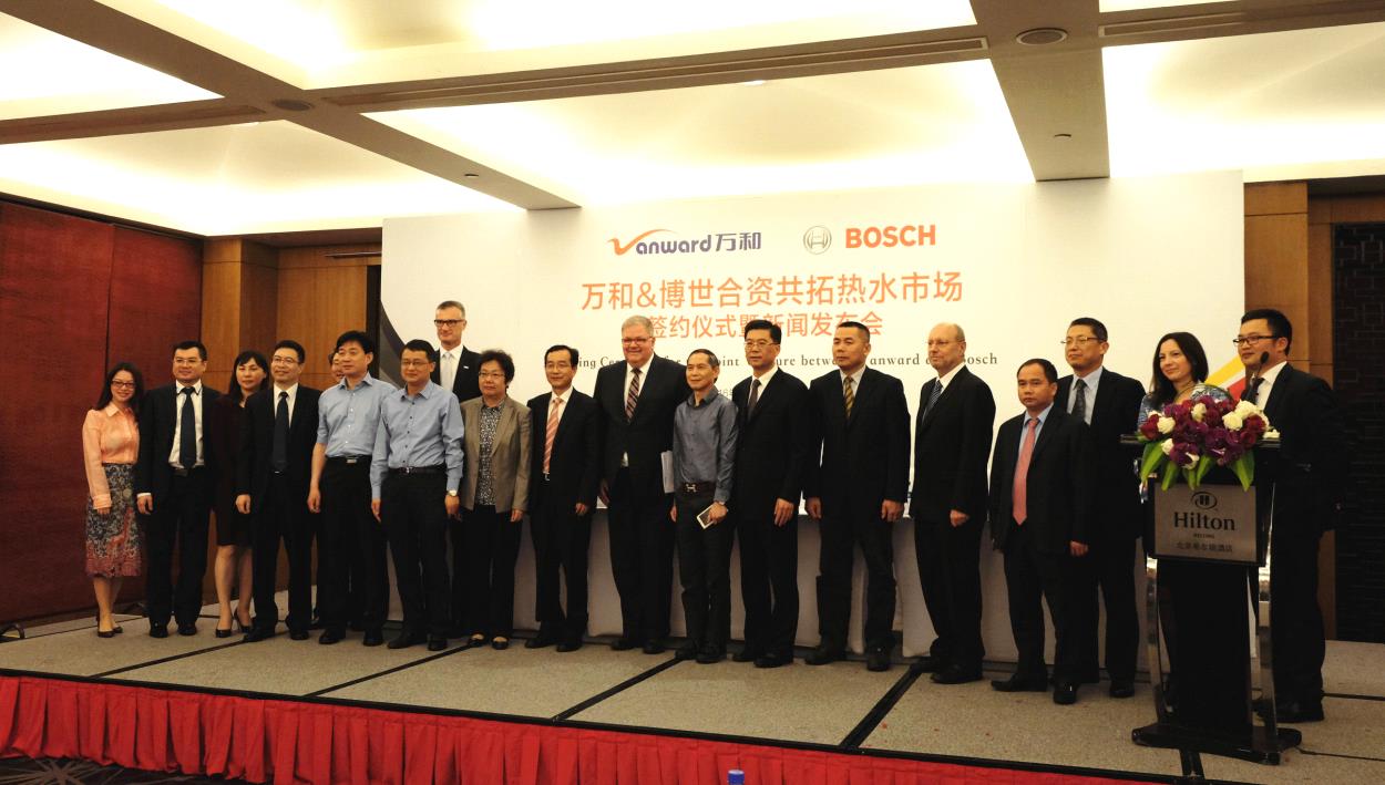 出席万和与博世合资签约仪式暨新闻发布会的领导、嘉宾合影留念 随着人们生活水平的不断提高,选择健康绿色的生活方式成为现代家庭的普遍追求,对于热水器行业来说,绿色健康的热水器无疑能够成为当下热水器市场的新卖点。热水器产品从早期的安全叠加速热再到目前的抑菌健康,发展思路明晰,这个思路主要以用户需求为基本出发点,以解决用户的需求为最终落脚点,按照这个思路走,未来热水器市场的发展道路将越来越宽阔。 万和热水器一直走创新环保科技路线,1992年万和发明了中国第一台超薄型水控式全自动燃气热水器,引领中国热水器进入了“水阀一开、热水即来”的时代。自2011年上市以后,万和投资三个多亿去打造绿色、节能、智慧一系列的产品。包括空气能和太阳能这些新能源组成整个热水系统,现在万和的产品已具备WIFI功能,对整个产品的耗能状况、热水状况、安全状况可以做到全天候管理。而博世在节能环保方面也是不遗余力,2000年博世进入中国,始终致力于为用户提供智能、现代、环保、高效和创新的产品及解决方案。 中国家用电器协会理事长姜风在签约仪式中发言中表示:“博世热力技术有全球化的研发平台、持续创新能力和国际化管理经验,万和有制造优势、渠道资源以及本土化运营优势,两家公司的牵手是强强联合,更是优势互补。相信双方的合作将促进中国家用热水器产业的发展,开启热水器产业新的篇章。 万和与博世热力技术的合作对中国家电行业未来发展具有积极的意义。在中国家电产业发展道路上,需要以开放的胸襟引进先进的技术和管理经验,学习吸收优秀价值观和全球化经营理念,只有这样我们才能涌现出一批拥有技术创新和管理创新能力,具备诚心,开放与追求卓越价值观的企业,才能实现我们家电强国的目标。我们希望未来的合资公司,通过更加具有科技感、节能环保的产品,推动中国热水器产业向更高水平发展,为满足人民对美好生活的向往做出新的贡献。”