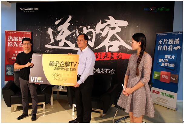那既然是给创维电视的消费者送内容,不忽悠来真的!主持人替消费者向刘总裁要了一个承诺,在2年VIP影视特权卡上签署刘总的大名,让大家见证这一战略的正式开启!总裁的潇洒一挥,看似轻松,可这背后是一个实干企业底气的体现——创维为用户买单,将付费内容和会员权益送给用户。场外腾讯视频客厅产品部总经理赵罡和电子商会陆刃波也发来了VCR以表示对此次发布会的重视,赵总对腾讯企鹅TV实力的信心满满,依托腾讯视频海量的版权资源,企鹅TV拥有600万小时以上的丰富内容,包括电视剧、电影、综艺、动漫、体育等几十个类目。从创维播放的宣传片中来看,内容确实是极具吸引。