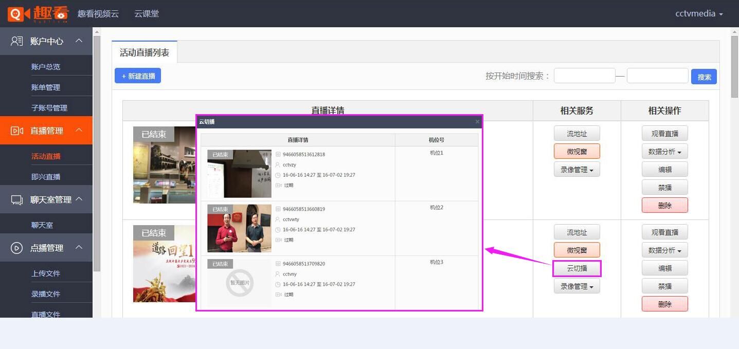 倒不是说一次对比,就能作高下之分。事实上,一个完整的直播过程,包括但不限于以下环节:采集、处理、编码、封包、推流、传输、转码、分发、拉流、解码、播放、互动。从推流到播放,再经过中间转发环节,问题发生的机会很多,降低问题发生概率就需要不断的优化和测试,然后才有相对成熟的产品和经验,至少在这点上,央视网从趣看视频云的产品服务中感受到了。 回到《道路:回望1921》,在技术方案配置上,央视网此次直播选用“移动直播台APP+移动演播室+视频云平台”的产品组合拳,而估计最令新闻工作者感兴趣的,是央视网记者如何利用12台手机完成如此重大的新闻直播? 1. 央视网需要在趣看视频云平台创建一个活动直播,并通过云导播功能配置12个手机机位,并将12个子帐号分发给12个直播点的前线记者;