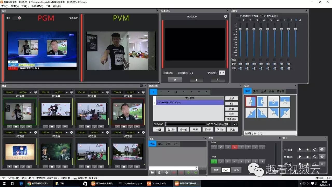 2. 前线记者拿着安装了移动直播台APP的智能手机,以移动直播台APP来完成现场的采集(拍摄)、编码、封包、推流、传输等环节,并通过趣看视频云平台实现存储、分布式转码、CDN分发、解码/渲染、直播时移、播放互动等; 3. 在移动演播室设备上登录趣看主帐号,正在直播状态的直播源(子帐号)会自动拉流到移动演播室的对应输入信道,后方团队就能实时进行12路直播信号的拉流、切换、特效、推流等操作,将直播画面转推流至央视网的演播室大厅进行实时播报。 从上述描述中,不难看出,即便是一场如此重大的新闻直播,其操作完全不似传统电视台那般声势浩荡,动辄出动数辆大型直播车,调用人员更是数以百计,相对是极其简易可行的。另外,不止是移动直播台APP,新近完成重大升级的移动演播室设备在此次直播中也是大明星。
