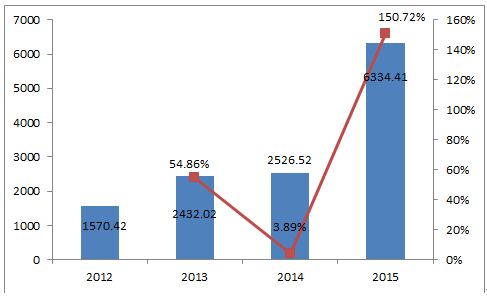 在发动机领域,虽然康沃动力和一些老牌国有发动机制造企业相比成立时间较短,但公司凭借持续的研发投入、领先的创新意识和工匠精神,有效掌握了提高内燃机燃油效率、降低噪音和控制污染排放、制造工艺方面的核心技术,成为国内最先进的发动机制造企业之一。特别是在大功率发动机领域,公司是国内少数能够生产符合欧四、欧五标准大功率发动机的企业。 2 经营情况分析:业绩步入高增长轨道 作为发动机领域的后起之秀,康沃动力虽然目前的体量较小,但呈现出了非常快速的增长态势,充分体现了一家优质创业型企业的高成长特性。公司2012年—2015年的营业收入分别为1570.42万元、2432.02万元、2526.52万元和6334.41万元,年均复合增长率达到59.2%;进入2016年,公司的经营业绩呈加速增长态势,公司今年1-6月实现营业收入6017.37万元,同比增长292.52%,已接近2015年全年,预计2016年全年业绩暴增将是大概率事件。 图:公司营业收入高速增长 ![]()
