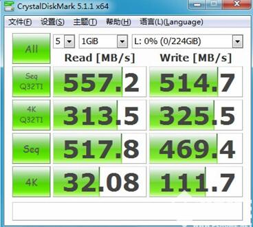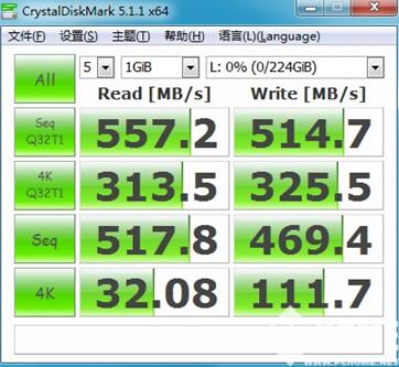 CrystalDiskMark的读写性能更好一些,连续读写最高达到557.2MB和514.7MB,4K写入性能也非常出色。