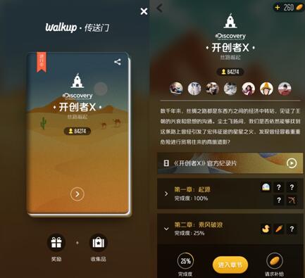 此次合作双方秉承一贯的创新、探索精神,深度研发,精诚合作,将Discovery中国主题纪录片深度植入进WALKUP的传送门功能中,通过观看视频寻找线索来进行答题。这一创新式的视频融合方式,在丰富WALKUP自身内容的同时,极大提高了WALKUP的可玩性与知识性,让广大用户可以通过观看视频与文字两方面了解知识探索历史。