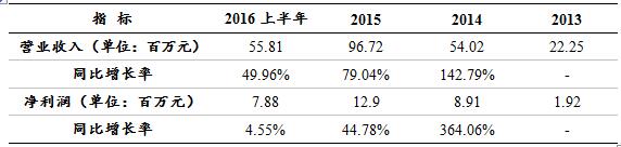 公司经营业绩处于高速增长轨道。公司2012年-2015年实现的营业收入分别为1527.59、2225.1万元、5402.26万元和9672.7万元,近3年年均复合增长率达到85%;实现的净利润分别为27.66万元、191.94万元、890.73万元和1289.79万元,年均复合增长率更是达到惊人的260%。进入2016年,地源科技的经营业绩继续保持快速增长,公司今年1-6月实现营业收入5580.57万元,同比增长49.96%;实现归属于挂牌公司股东的净利润787.9万元,较上年同期增长4.55%。凭借突出的业绩成长性,公司入选了新三板第一批创新层企业名单。地源科技突出的业绩增长速度,充分体现了一家优质创业型企业的高成长特性。 表 1:公司历年营业收入及净利润情况