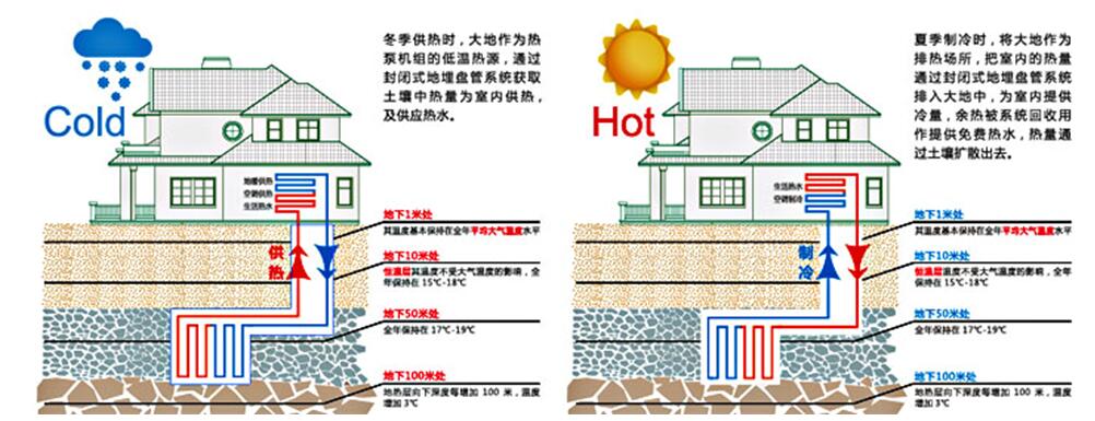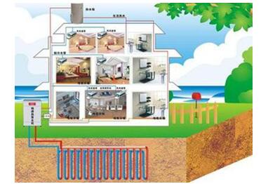 数据来源:公开资料 在南方,虽然政府并不强制房地产商开发的房屋交付时必须配备供暖设施,但随着人们生活水平的提高和收入的增加,人们人们越来越希望享受温暖、舒适的生活和办公环境,因此,越来越多的房地产项目开始为住宅和办公楼提供地暖系统,预计未来几年,南方采暖工程市场空间或将增大,尤其在南方的三四线城市的采暖市场上,这种增长可能会更为明显。据统计,在上海、武汉、宁波等大部分采暖市场相对活跃的城市,新建住宅中地暖系统应用量的增长幅度远远超过同一地区散热片的增长幅度,特别是在上海和江浙地区的不少城市,地暖在新建住宅中所有供暖末端系统中的比重已经占到90%。 3.公司竞争优势突出,工装业务仍具巨大成长潜 地源科技的工装业务主要是为大型房地产企业的房地产项目提供供暖、净水设备、新风系统的方案设计、设备采购、工程施工、安装调试等产品和服务,主要针对精装房市场。我们认为,随着越来越多的精装房项目开始为住宅和办公楼提供地暖系统,地暖的工装市场也越来越大,公司作为行业一流的供暖系统(包括地源热泵和其他供暖系统)的集成商,在技术服务、供应渠道、集成能力、客户资源等方面都具备较强优势,未来必然能够充分受益于地暖市场快速增长带来的巨大商机。 3.1掌握核心设计和施工工艺技术 按热源分类,地暖一般分为水热和电热。其中水热包括地源热泵,空气源热水泵,壁挂炉,燃气(煤、电)锅炉等;电热主要是指发热电缆。就地源科技而言,公司主要的产品是环保和经济性能更好的地源热泵、燃气(光伏)挂壁炉等供暖系统。 其中,地源热泵技术是利用土壤源中吸收的太阳能和地热能以及地球表面浅层水源(如地下水、河流和湖泊)等,并采用热泵原理输入少量的高品位能源(如电能)实现由低品位热能向高品位热能转移,实现既可供热又可制冷的高效节能空调系统。通常地源热泵消耗1kWh的能量,用户可以得到4.4kWh以上的热量或冷量,具备良好的经济、高效、节能特性。 图 5:地源热泵系统示意图