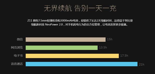 努比亚号称是手机中的单反机,完全不是在吹牛。身为一个单反相机的拥有者,我不得不承认,努比亚在拍照方面不仅硬件出彩,功能的设计也非常人性化。它的存在让一个即使从未玩过单反的人,都能轻松拍出各种大师级照片。为什么我突然觉得,从今以后自己出行似乎可以彻底告别单反了呢! 拍照效果满意了,再让我们来看看它的续航能力。拍照是智能手机中一个极其费电的功能,如果一款手机连续拍照一个小时就关机,那效果即使再出彩也都不适合出游携带。 努比亚Z11黑金版拥有一块3000mAh高密度聚合物电池,属于当下手机行业中等偏上的配置。但努比亚真正续航的秘诀却是NeoPower2.0技术,努比亚Z11黑金版在导航、录像、拍照、大型游戏、社交软件、网页浏览、音乐播放、在线阅读、高清视频和通话,等多种用户最常使用场景上进行全面优化,通俗点说这就是把好钢用在刀刃上。